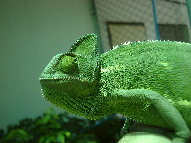 左右同時に、または同一方向に動かない目。くるりと巻かれた、時にはバランスを取るために何かにしがみつく可愛らしい尻尾。忍者顔負けのカモフラージュ術。そして獲物を捕まえる時の、生体の体よりも長く伸びるものもあるというあの舌が特徴です。カメレオンの仲間の中でも大型で、色彩感覚に富み、比較的飼育しやすいといわれます。突起するエボシ風の頭の形は愛敬とユニークなキャラクターを見せます。 カメレオンは全般的にテリトリアル(自分の縄張りを作る習性)があるようです。特にエボシカメレオンはその習性がつよいそうです。餌は虫を主食とすると言われていますが、植物の葉なども食べるようです。飼育ケースのなかにはハイビスカスを入れてあげるとよいそうです。 |