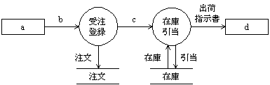 問29 得意先からの注文がオンライン端末から入力されると,注文の記録を取り,在庫を引き当て,倉庫に設置してあるプリンタへ出荷指示書を出力するシステムがある。 DFD を使ってこのシステムを記述したとき,a 〜 d に当てはまる語句の組合せとして,適切なものはどれか。