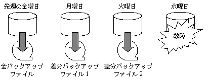問38 ある部署では,サーバのディスクにあるファイルを業務終了時点でバックアップしている。土曜日と日曜日は一切の業務を行わないので毎週金曜日に全バックアップ(すべてのファイルをバックアップする)をしており,そのほかの平日は差分バックアップ(全バックアップ以降に更新されたすべてのファイルをバックアップする)をしている。水曜日の朝にサーバを起動しようとしたところ,ハードディスクが故障していることが判明した。最新状態へ復旧するために必須な最少のバックアップファイルの組合せはどれか。