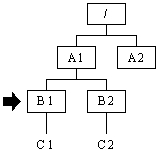 問10 図の階層型ファイルシステムにおいて,カレントディレクトリが矢印で示す B1 であるとき,ファイル C2 を指定するものはどれか。ここで,ファイルの指定は,次の方法によるものとする。
