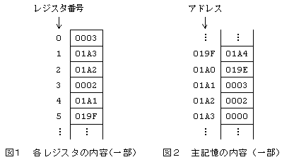 次の二つの命令語がある。これらの命令語の実行直前の各レジスタ及び主記憶の内容は,それぞれ図 1 及び図 2 に示すとおりとする。各内容は,16