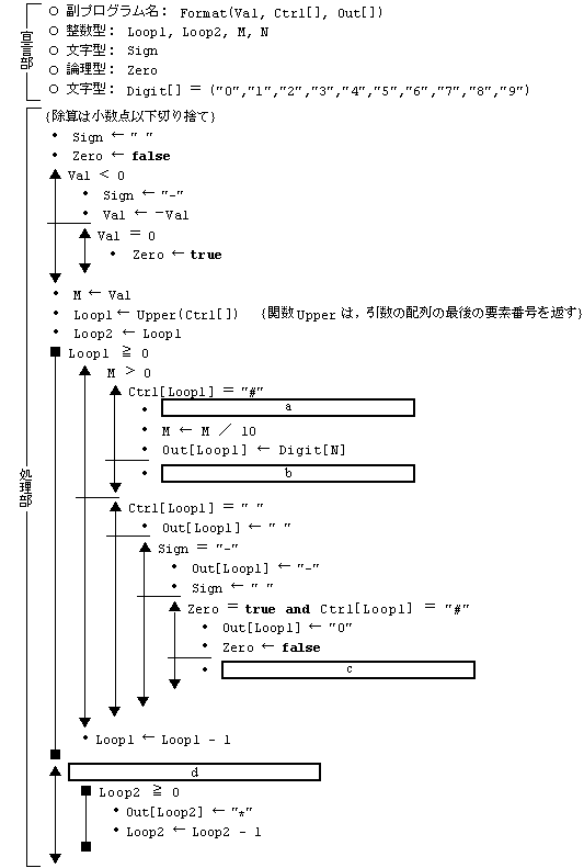 (1) 副プログラム Format は,配列 Ctrl に格納されている書式文字に従って,変数 Val に格納されている整数値を 10