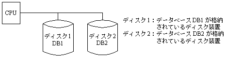 図に示すように 1 個の CPU 及び 2 台のディスク装置から構成されるサーバがある。各ディスクには,図のようにそれぞれデータベース DB1