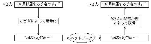問52 公開かぎ暗号方式を用いて,図のように A さんから B さんへ,他人に秘密にしておきたい文章を送るとき,暗号化に用いるかぎ K として,適切なものはどれか。