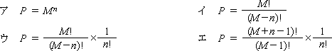 問54 パスワードに使用する文字の種類の数を M ,パスワードのけた数を n とするとき,設定できるパスワードの個数 P を求める数式はどれか。